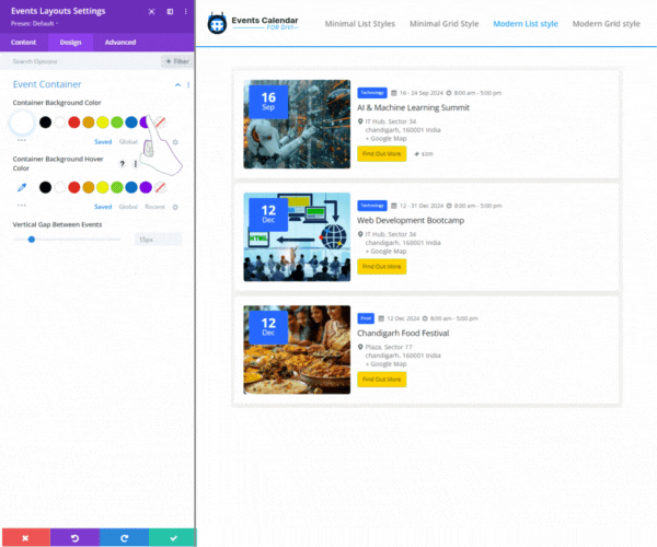 - You can customize the display of your events by setting different styles for the title, date, image, and description.