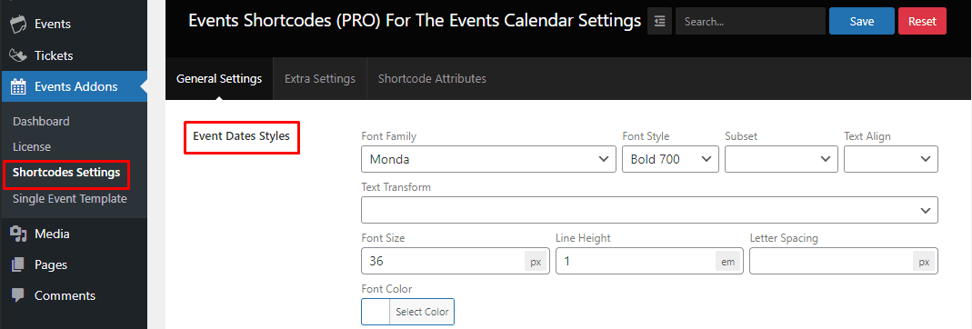 9.) Event Dates Styles:- Event Dates Styles is used to change the Date Font Family, Font Style, Subset, Text Align, Text Transform, Font Size, Line Height, Letter Spacing, and Font Color.