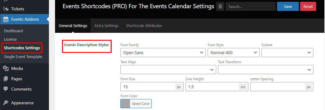 7.) Events Description Styles:- Events Description Styles are used to change Description Font Family, Font Style, Subset, Text Align, Text Transform, Font Size, Line Height, Letter Spacing, and Font Color.