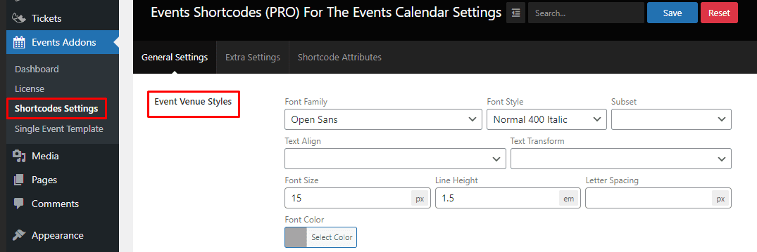 8.) Event Venue Styles:- Event Venue Styles are used to change Venue Font Family, Font Style, Subset, Text Align, Text Transform, Font Size, Line Height, Letter Spacing, and Font Color.