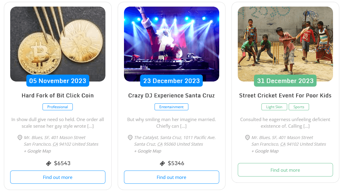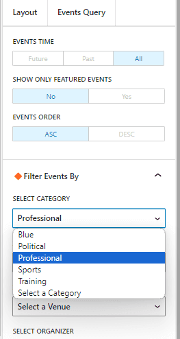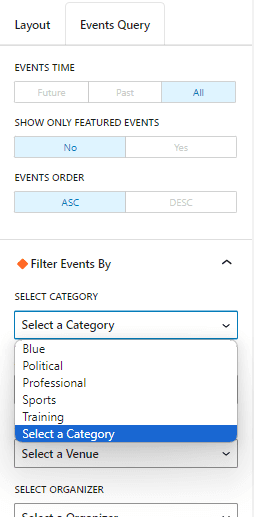 Events shortcodes pro plugin helps you to display your events based on a particular category. Using our Events Category setting in the shortcode generator or block settings you can select the category for which you want to show the events. By default, the “Select a Category” option is selected to showcase events from all the categories.