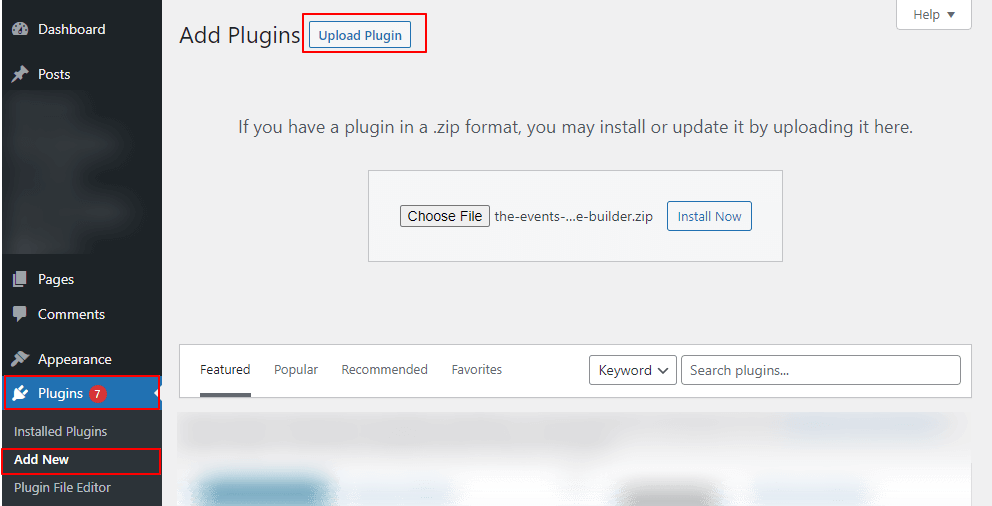 - From the left menu go to Plugins >> Add New >> Upload, to install the plugin.