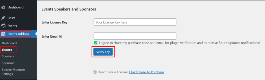 1.) Go to Events Addons >> License
