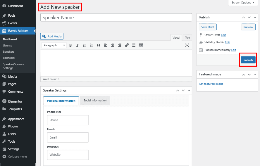 After filling out the necessary fields, click the Publish button to save the new speaker profile.