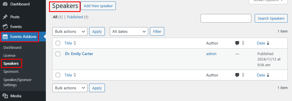 After installing and activating the plugin, you’ll find Speaker and Sponsor submenus located under the Events Addons menu in your WordPress dashboard. Let’s go through the basic setup steps to get started with creating speakers and sponsors for your events.