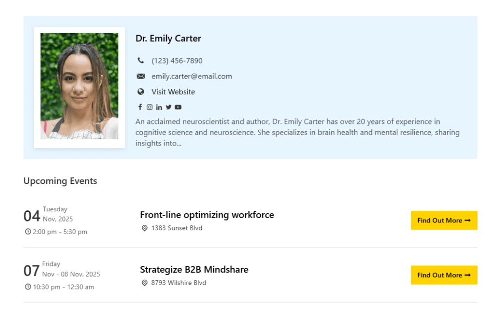After creating a speaker profile, a single speaker page will be generated. This page will display the speaker’s details as entered in the profile, including their name, description, contact information, social media links, and featured image.