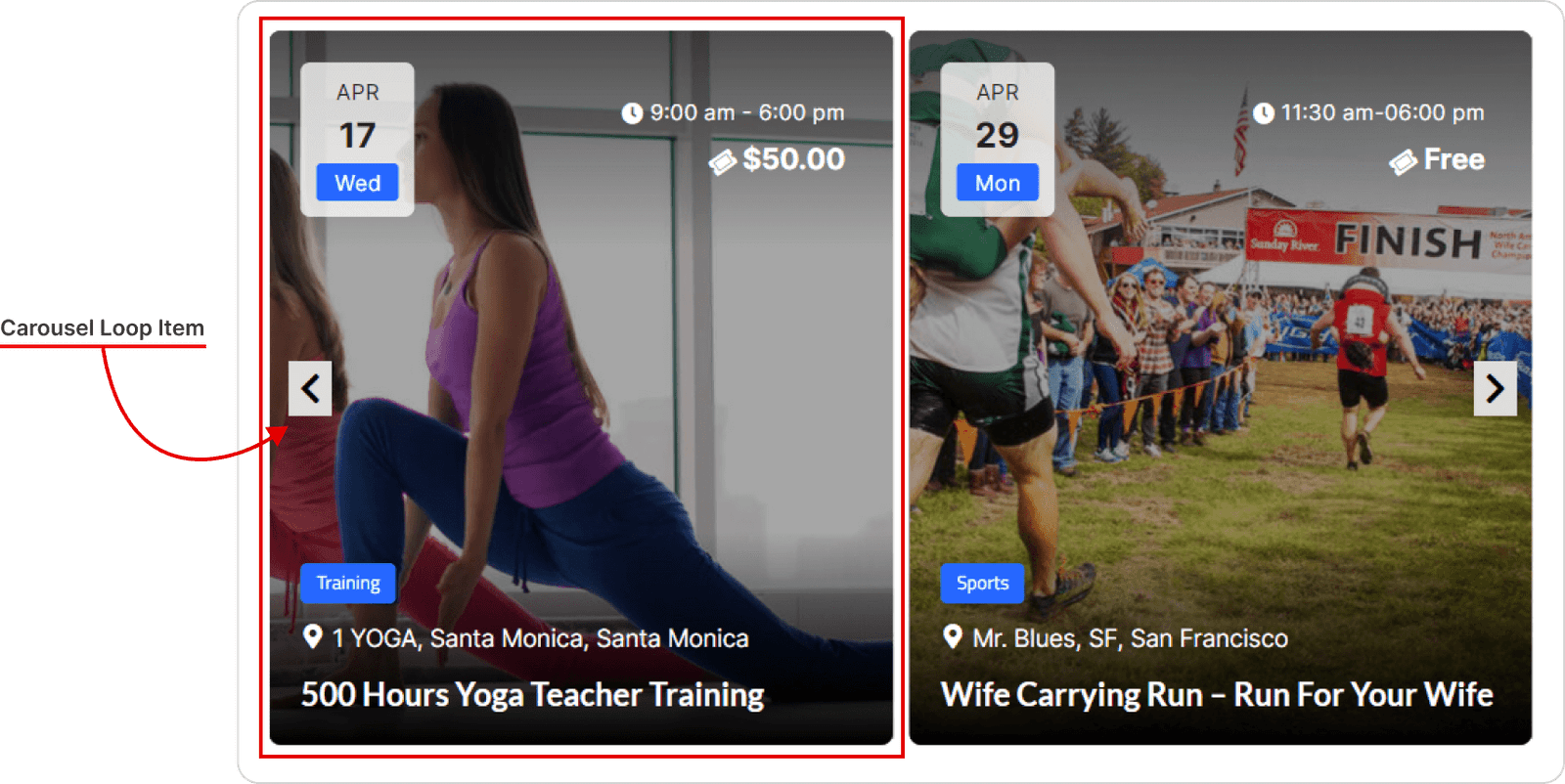 A “loop item” typically refers to an element within a loop or series. Here, loop item is a design that you used to showcase your events series in a loop structure like List, Grid and Carousel.