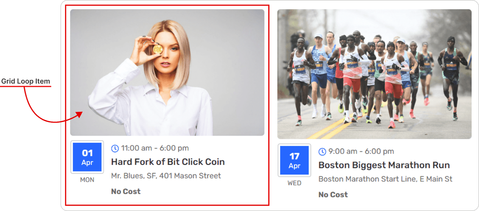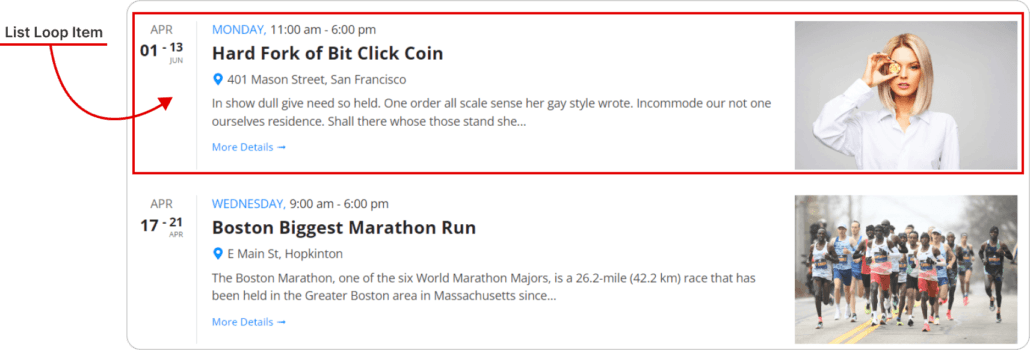 Our plugin offers a selection of six pre-designed loop item templates, including four unique loop list item designs and two distinct loop grid item layouts. These loop items are conveniently accessible through our Events Loop Widgets.