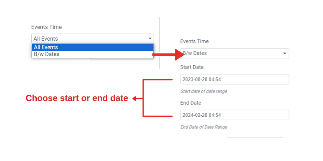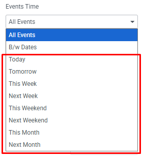 - Events Time: This setting by default uses the All event value that shows all events. But you can change that to show events between the date range by specifying the start and end dates of events.