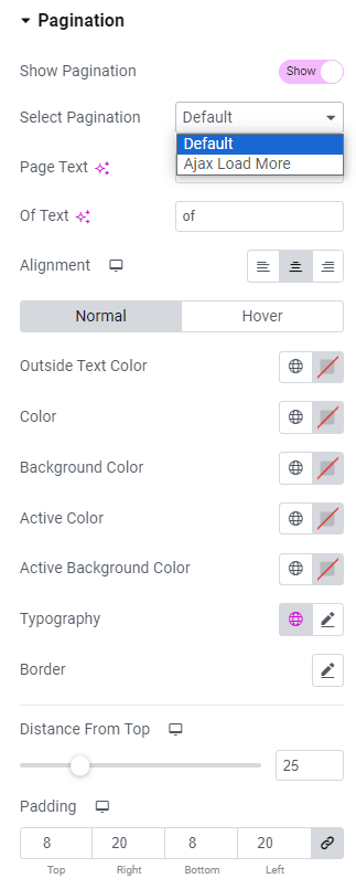 - Select Pagination: There are two ways to add pagination one is default and another is Ajax Load More. The default option displays page numbers, while the Ajax Load More option loads events dynamically using Ajax.