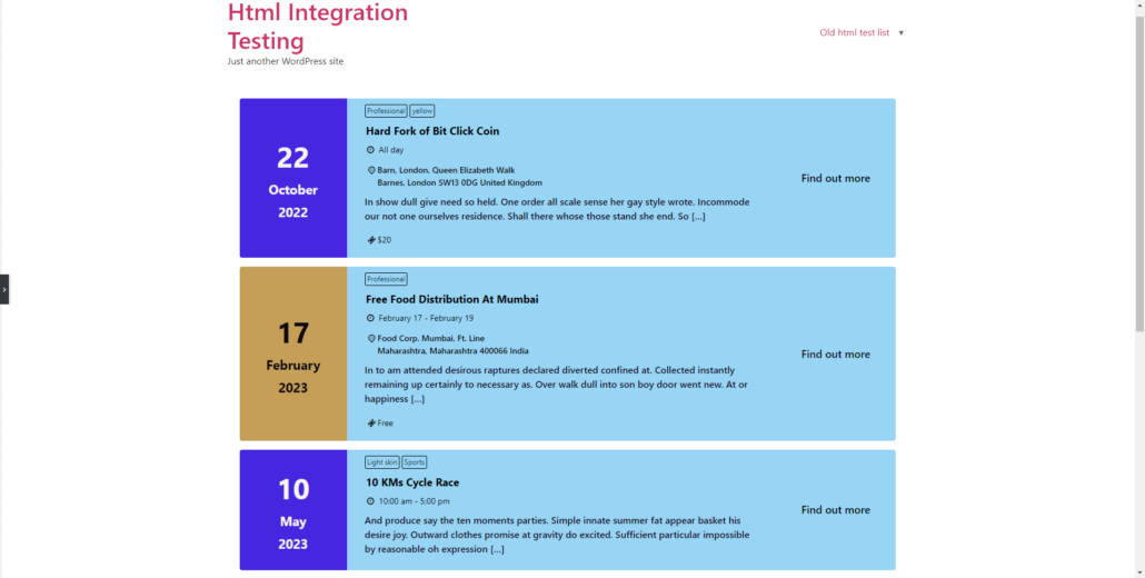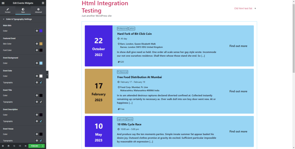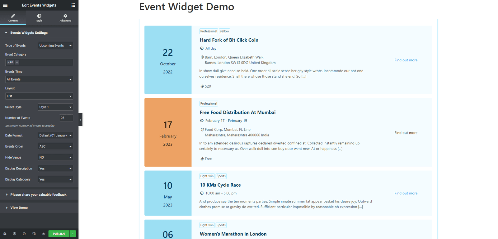 The plugin provides you with a simple widget. Using this widget, you can easily showcase your events on the home page or any other Elementor pages. You can display your events in three types of Layouts: List, Minimal list, Calendar.