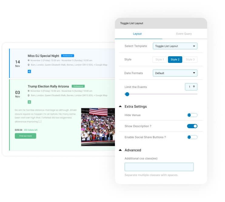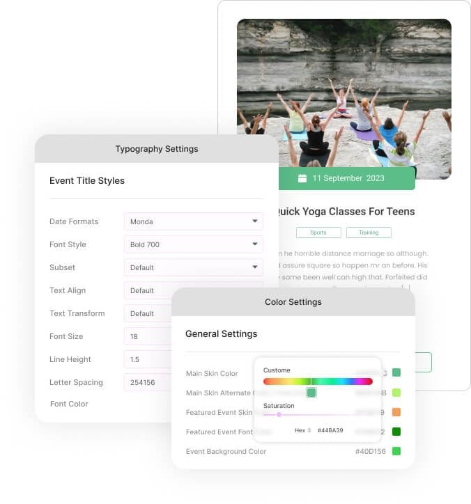 Customize your events list title, description, date and other elements colors and text styles via easy to use settings panel.