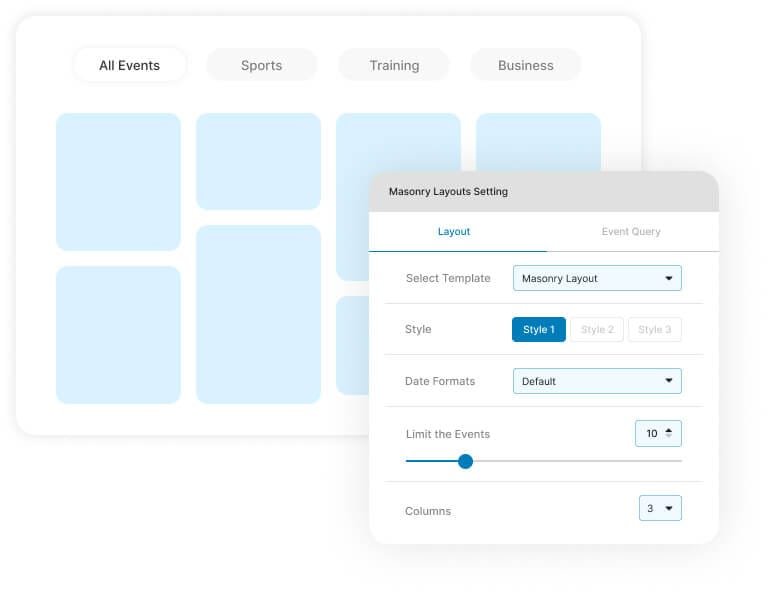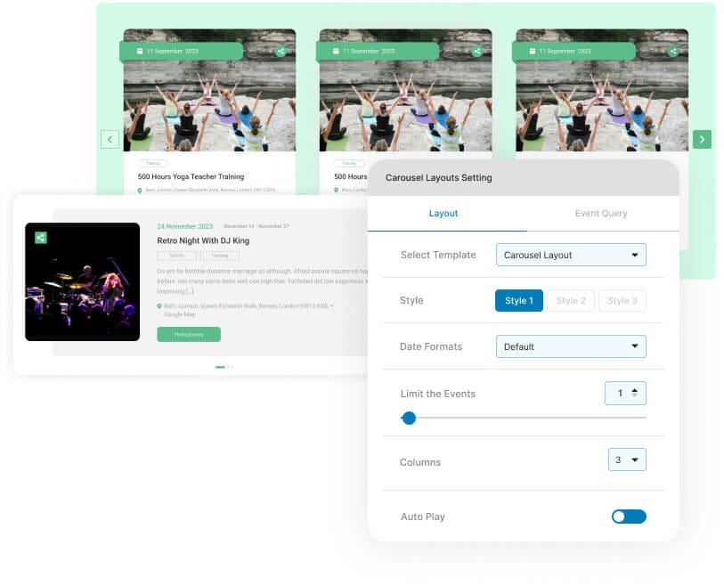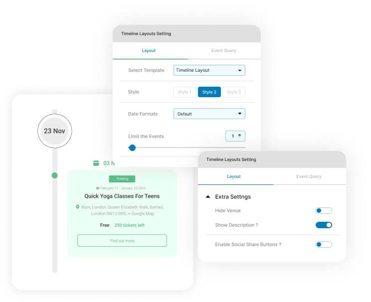 Display events in list, grid, carousel, slider, masonry or timeline layout easily by just changing an attribute inside your events shortcode.